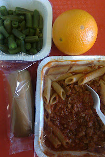 Today’s menu: pasta with meat sauce, orange, green beans, breadstick, milk.