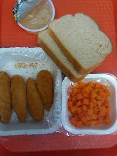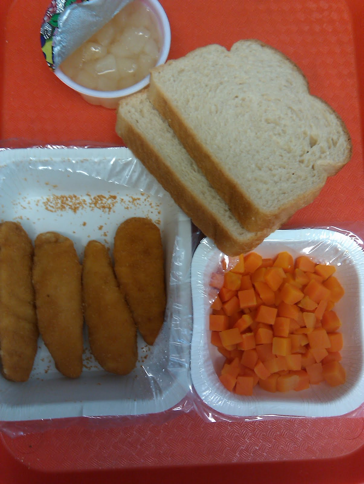 Today’s menu: chicken nuggets, two slices of bread, carrots, fruit cup, milk