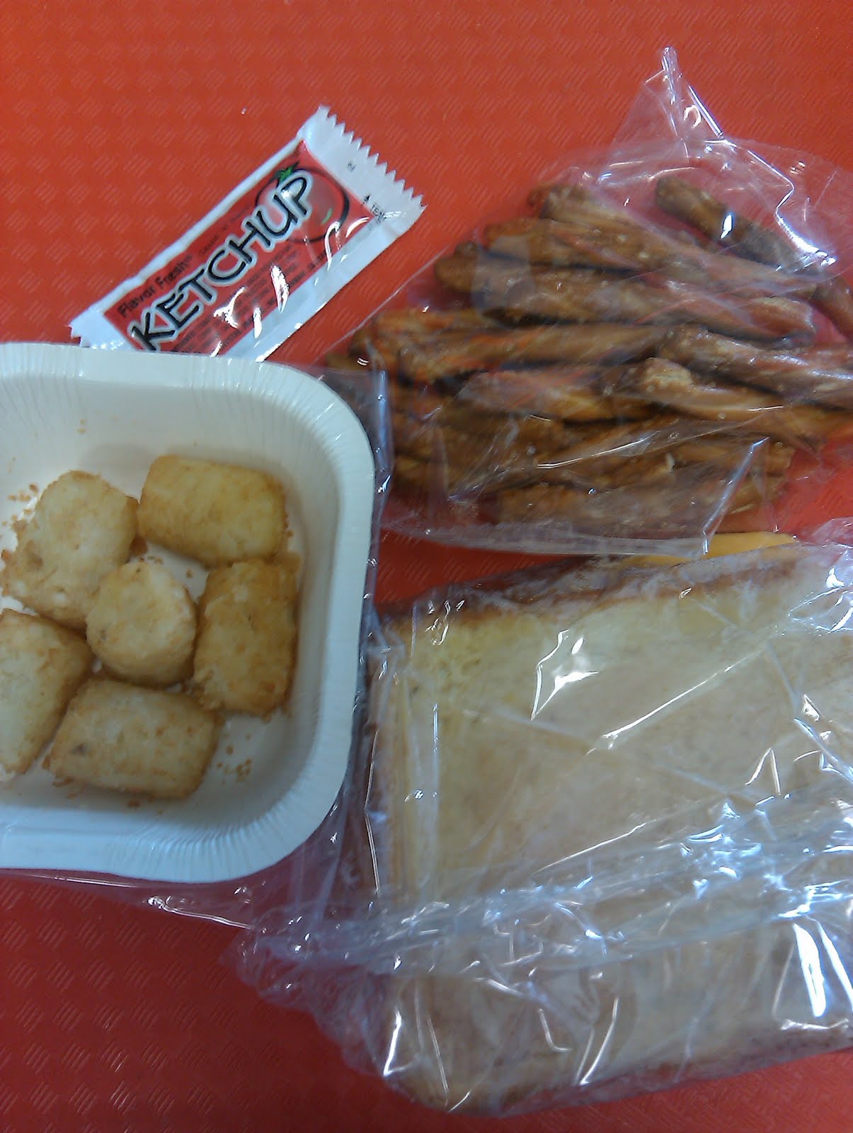 That lunch looks awful. Tater tots pretzels and cheese sandwich. The only good thing was the unripe fruit. Not a veg in sight. I think what really bothers me is that the food is so colorless. They should be serving a rainbow of colors and I don't mean dayglo.