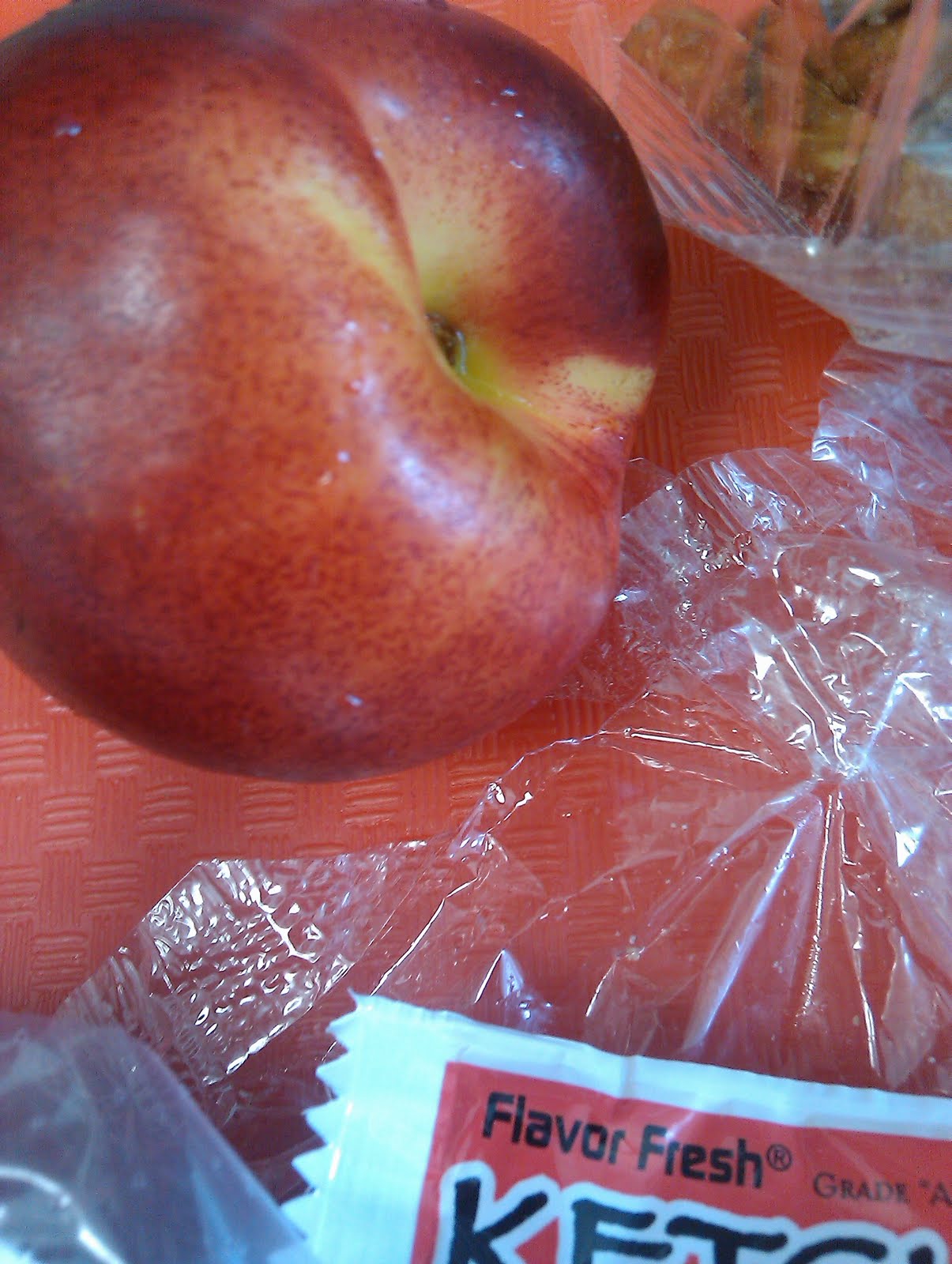 I don’t like processed cheese so I couldn’t finish the sandwich. I left the middle, which was thick with cheesy goop. And I didn’t feel like pretzels so I didn’t eat them. I put them aside for a snack, but they just sat there all day. I ate the nectar-apple though. Part of why I thought this was a peach (when I had it last week) was that it is so crunchy. I’ve been lucky in life because I have always eaten nectarines that disintegrated into juice and pulp upon first bite. Nectarines were so messy that my mom would avoid buying them. But the sweet juice trickling down my neck and stickying up my hands was a simple pleasure. This piece of fruit was more like a crunchy apple: my first bite snapped off (I ate the whole nectar-apple).