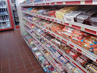 It was a win for the company, in eliminating the additional overhead of more workers plus benefits for the full time folks. But for folks like my boyfriend (a non-traditional student at the U) it was a loss. I recently met one of my former co-workers, a guy who had worked his way up from dishwasher to cook under the previous chef. Apparently they didn’t need him as a cook, either, so he’s been demoted down to a server at the cafeteria building. I can only imagine what they’re serving these days that requires 3 less full-time cooks (plus the other employees that lost their jobs) than it took a year ago to prepare decent food. My former coworker said that everyone wished the old chef would come back. Anyway, I currently work at a convenience store located across the street from the dorms and right next to a mobile home park and an apartment complex which in sum house hundreds of students during the school year, in addition to the full-time residents of our little town. The kids pop in all the time during the school year, and the food they eat makes me cringe. I took some pictures but here’s my summary: