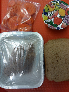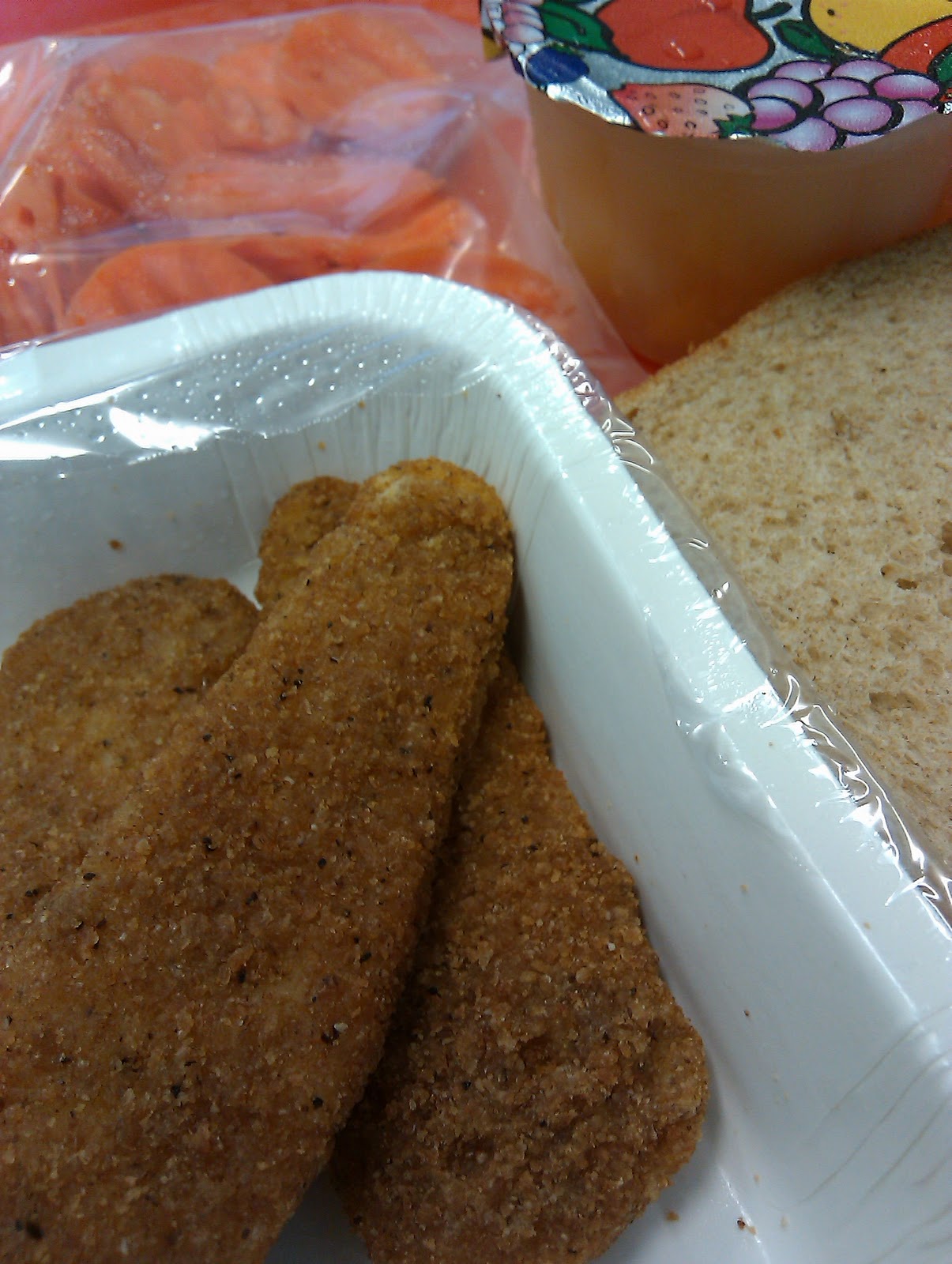I was so pressed for time today that I didn’t even get a chance to grab the bbq sauce. Luckily I had a small package of honey in my desk and I dipped the tenders/nuggets into the honey. I didn’t have time to eat the bread, carrots, or fruit cup today because I was called to a meeting. I ate the carrots as an after school snack, but by the time I got around to the bread, it was already a little hard on the outside.