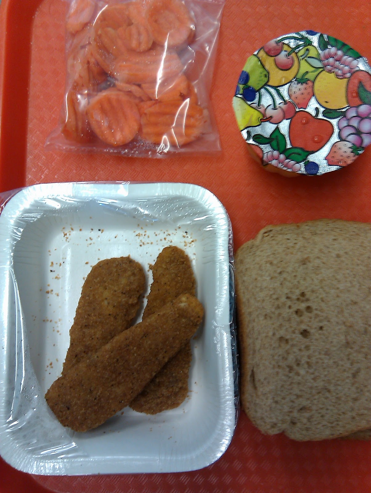 Today’s menu: chicken “tenders,” bread, fresh carrots, fruit cup