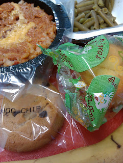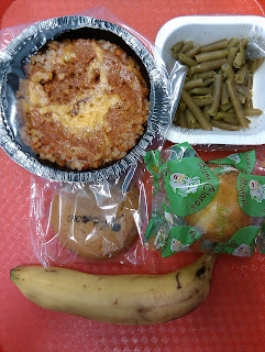 Today’s menu: tex-mex over brown rice, green beans, a cookie, a banana (and I somehow grabbed a muffin — it’s not on the menu)