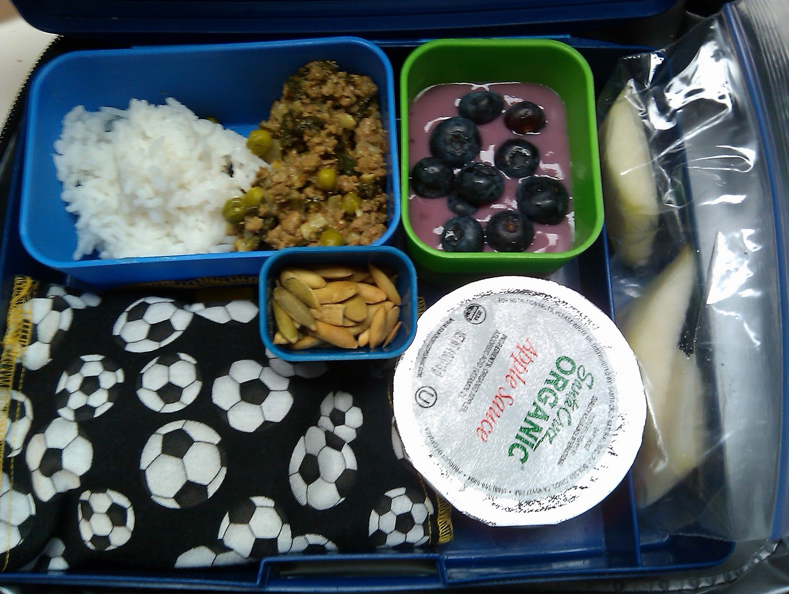 Some days his lunches looked similar to your son's: diced cooked potatoes and broccoli, leftover chicken I'd cooked the night before, peeled sliced fruit, diluted juice or milk, maybe some rice pasta in tomato sauce. Other (lazy) days, they were more like home-assembled lunchables: rice crackers and deli meat, supplemented with some grape tomatoes, yogurt, and a snack of fresh fruit. On average, I think he was pretty nutritionally balanced, and now that he's older, he prefers a packed lunch to the cafeteria food. I think his cafeteria does a pretty good job nutritionally (whole grain everything, unlimited servings of fruit and veg, baked not fried) but the appeal factor needs some work. For example, fruit he gets from home is way better (ripe mango, organic berries, pomegranate) than the hard crunchy pears and mealy apples they have in bulk at the caf. And the waterlogged veggies in the hot food line aren't winning over the broccoli haters anytime soon. I still have issues with things like the quality of meats used in the meals (it's that ammoniated beef and industrial poultry that can't walk around or reproduce unassisted), the lack of entree variety (definitely an over-reliance on nuggets, and it's the same 5-7 entrees looped over and over again) and how freely they like to dispense the chocolate milk.