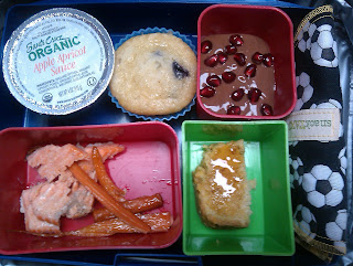 Applesauce, muffin, chocolate yogurt with pomegranate seeds,