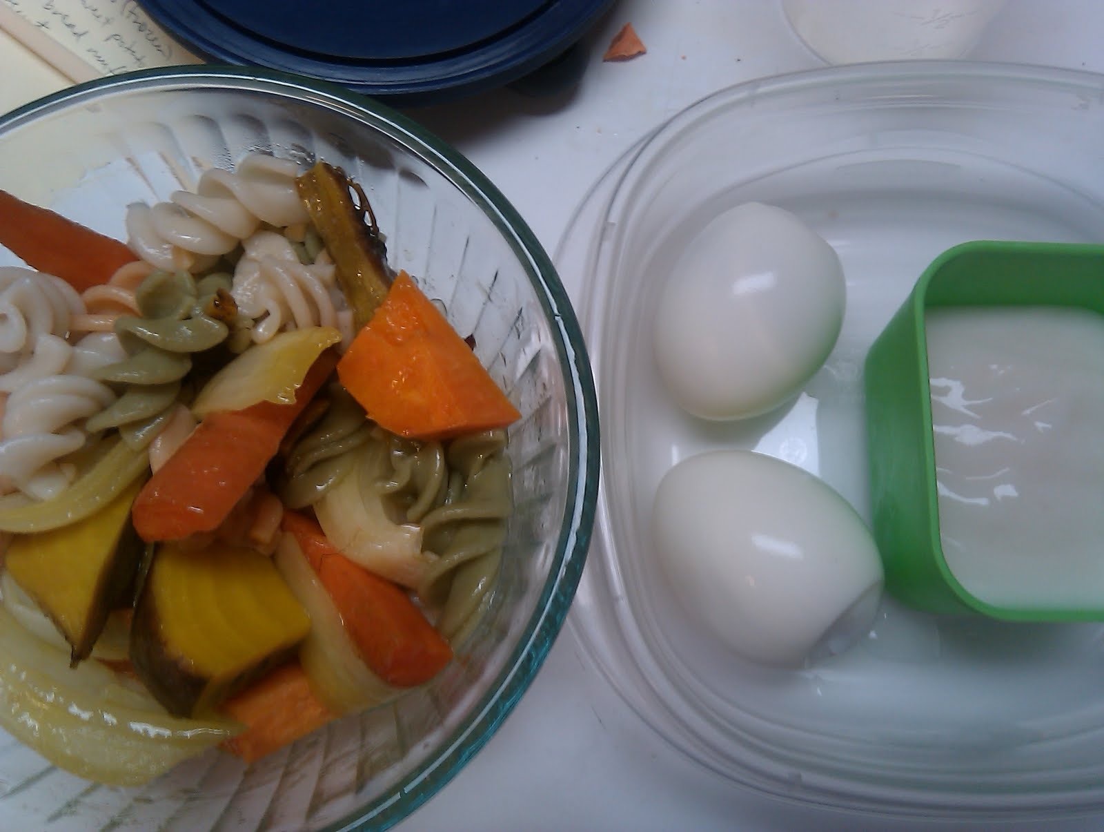 Roasted root veggies in pasta, hard-boiled eggs, yogurt
