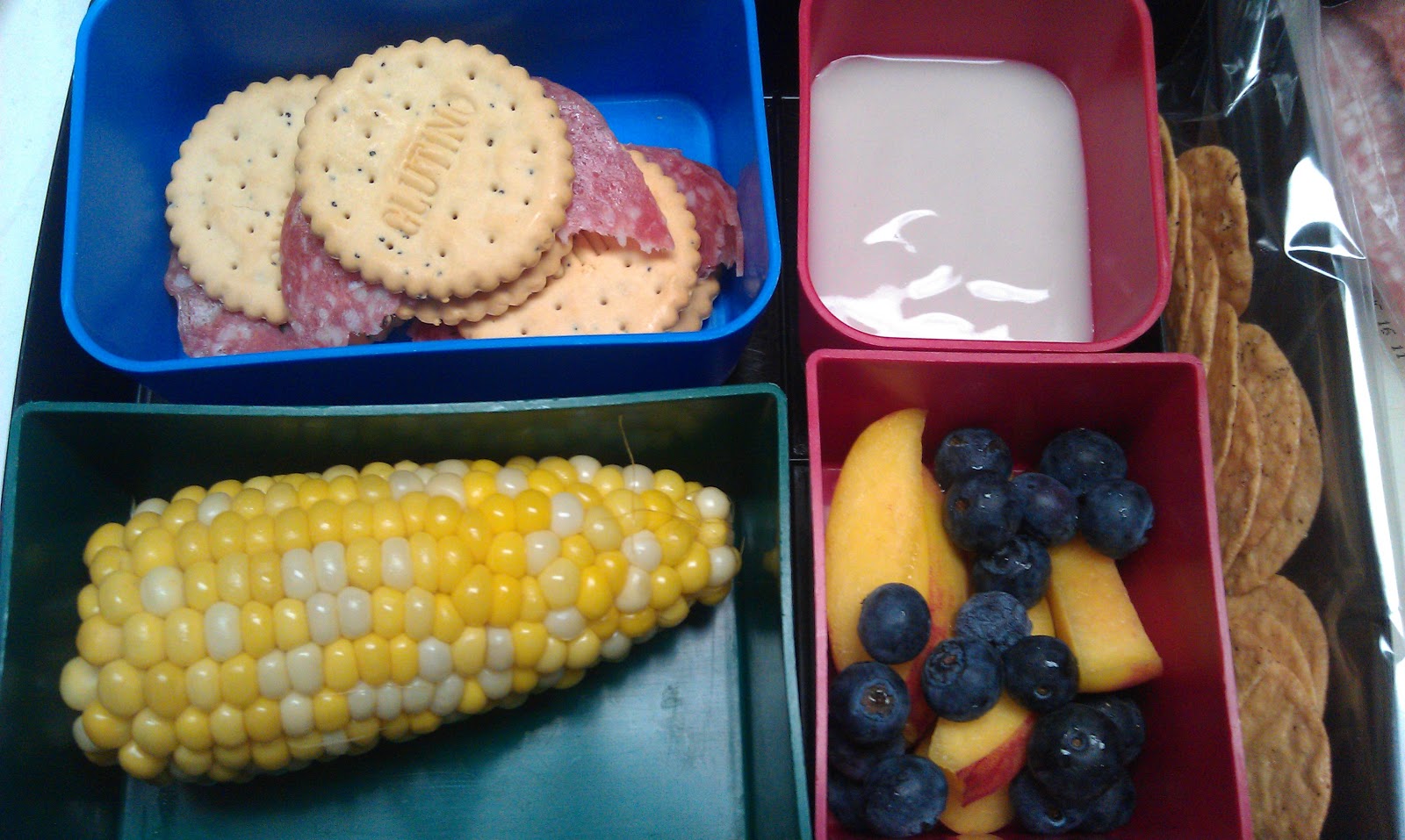 Lots of little finger foods. I sent along honey with the cornbread because that’s how I like to eat cornbread. It can be dry. Day care menu: Ground beef, tater tots, applesauce, peas with fruit and cheese and crackers for snacks