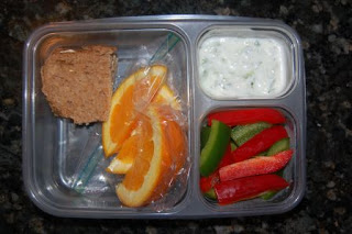 • Hummus sandwich on whole-wheat bread, oranges, and bell peppers with tzatziki dipping sauce